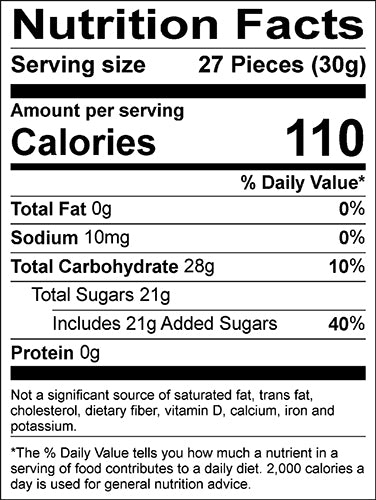 Ingredients: Sugar, corn syrup, modified food starch, contains 2% or less of the following: natural & artificial flavours, coffee, color added, vegetable & fruit juice (color), beeswax, carnauba wax, confectioners glaze.